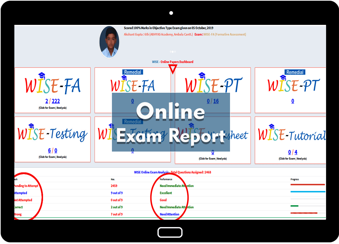 Report Card of each student is visble in Student Panel for WISE-FA, WISE-PT, WISE-Testing, Written Exams, Attendance, etc.
